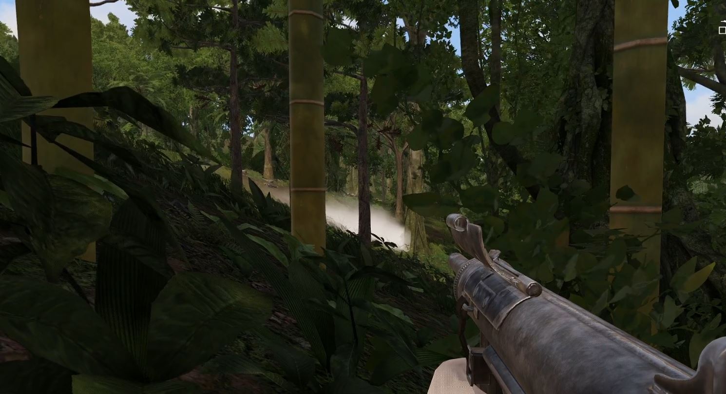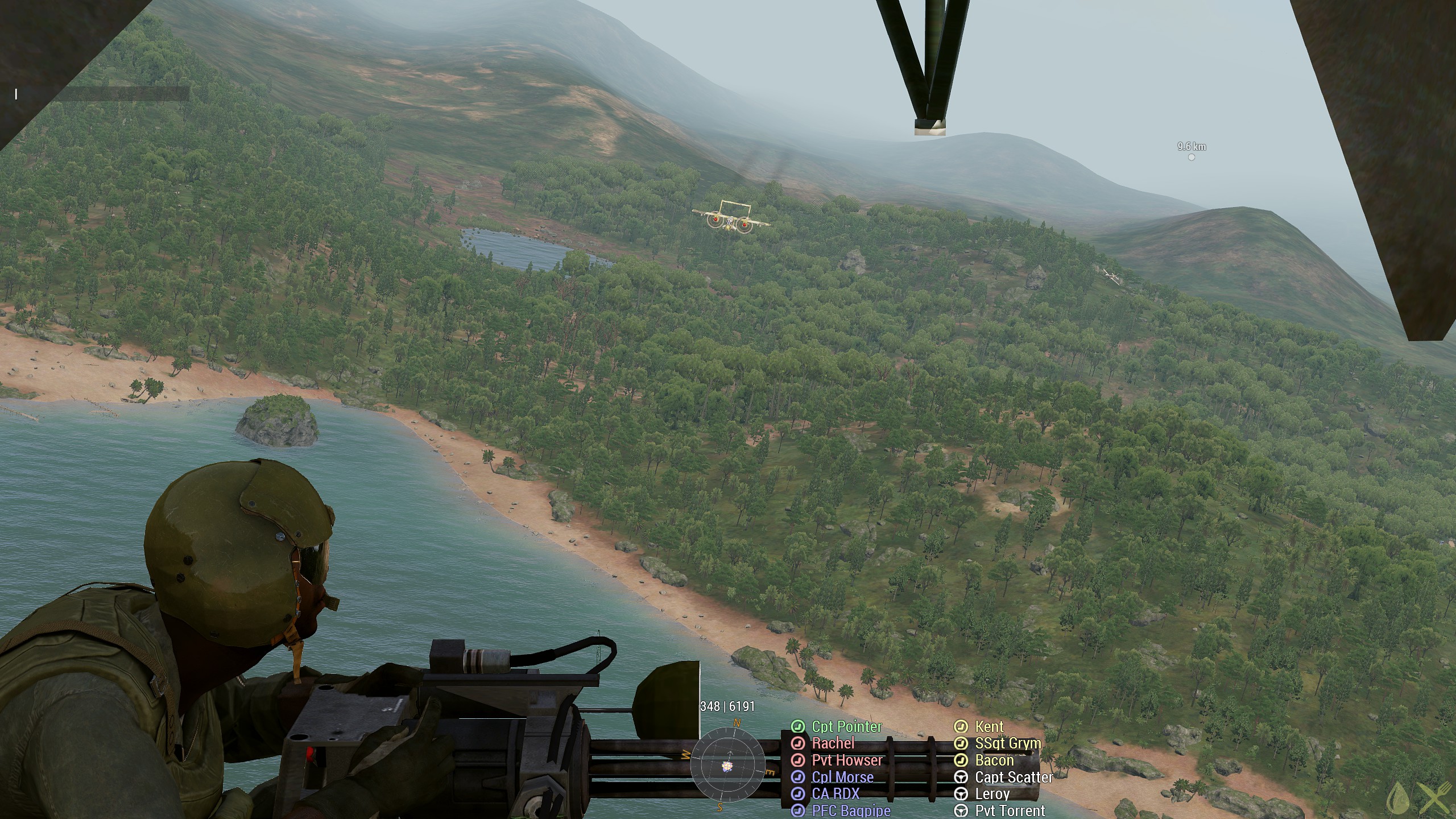 Anyway, I digress. We were off to San Bay Ban (I might have spelt that wrong), which is just across the water from Maxwell. It’s a dirt airfield, currently hostile, and there were chutes in the air just south of it. Broadly speaking, the plan was simple, land in a beachy cove and find the pilot, while the aircover ran strafing and bombing runs between us and the airfield to stop anyone trying to stop us. It started out really well too, it was even me that found the pilot so then the parajumper had to come to us rather than the other way round. We were all together and headed back to the LZ when one of the skyraiders got shot down, so we had to go find him, but also the Chelt made it through as the bombing runs ceased, so we had to run south along the coastline until we could find somewhere else for our helicopter to land.