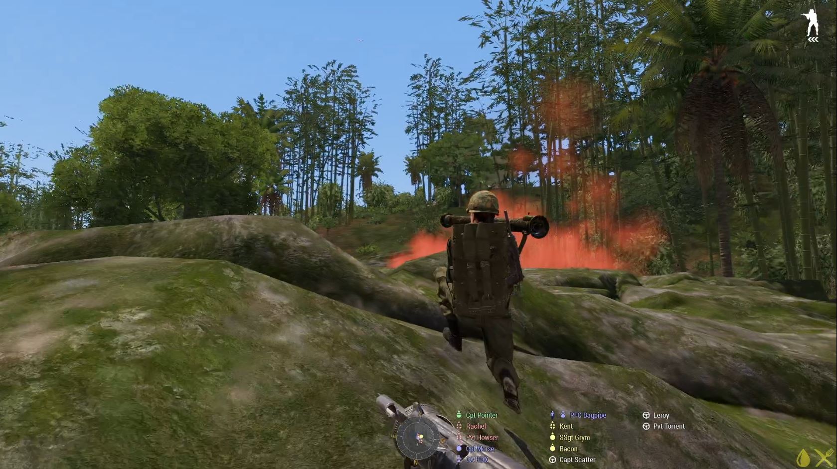 Mr Kent found an empty village, with some nice open fields for an LZ, so we vectored the squad to there, but that involved trying to get the original rescued pilot across a single log bridge. Honestly, I’m not sure what the Air Force do in Basic, but that was one of the hardest parts of the entire mission. We now have two rescued pilots and the helo taking fire on the ground as we run towards it. Turns out the lovely scenic hill by the village had an anti-air position on top of it, and they fucked up the helo to the point it couldn’t take off, then shot down the second skyraider, so now we have the initial rescued pilot, the first rescued skyraider pilot, the two pilots and two crew of the Jolly Green, and the second skyraider pilot in the burning wreckage of his plane at the top of a hill swarming with hostiles.