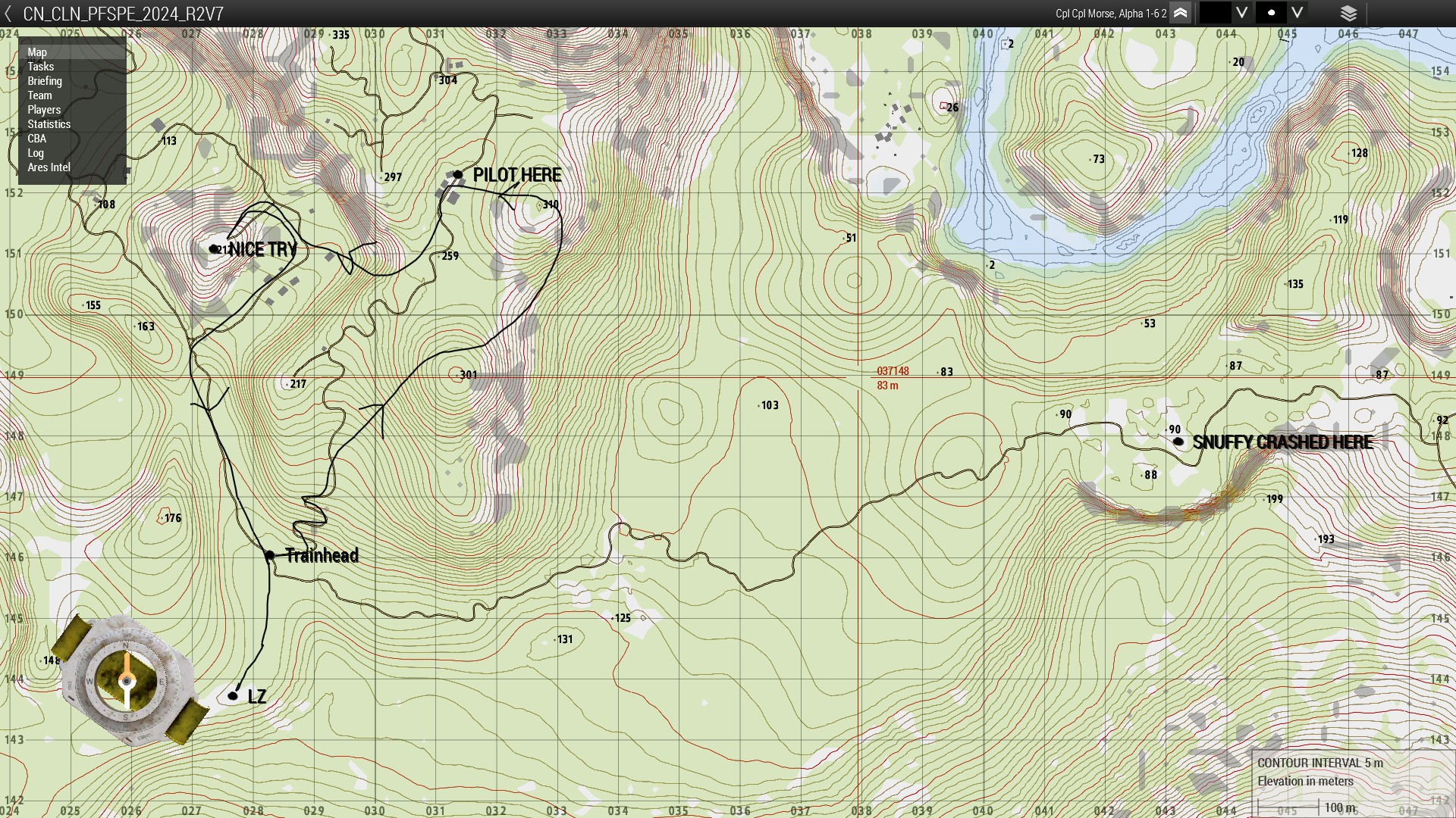 We didn’t have time to dwell on it though, as spotter smoke for their artillery landed amongst us and we had to run for it. Bagpipe and Patches were behind me but I was the last one down the hill to cover before the world shook beneath us. Leroy was first up the slope as soon as the explosions stopped, and found them emerging from where they’d taken shelter in the rocks on the far side. It likely saved them, but did quite the opposite for my blood pressure in that moment! As that LZ was clearly too hot we re-vectored back to where we’d inserted. Our route took us to within spitting distance of the helo’s crash site, so we went to take a look, but there was nothing we could do, so we continued down into the valley and evacced back to Maxwell with the rescued skyraider pilot.