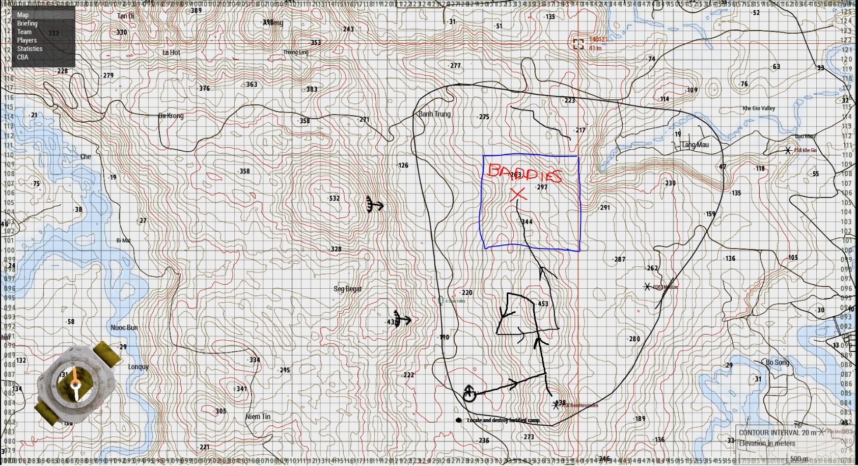 While playing peek-a-boo with the recoilless, only half of the squad had managed to resupply, and everyone was a little short as we were once again heading north. Fortunately, after clearing a couple of spider holes, we liberated a holy site on the slope of yet another hill. It had been well tended to, and I made sure the squad was duly respectful of it as we took advantage of the sacred bounty provided for us there. Somewhere along the way, in one of several scout camps we’d cleared, we found some intel that narrowed down our search area to where we were about to get to. It narrowed down from about ten grid square we had to check, to one, each grid square being one km squared.. or one square km... does it even matter if it’s just one?... Whichever, it was a much smaller area, even if it had taken us hours to get there.