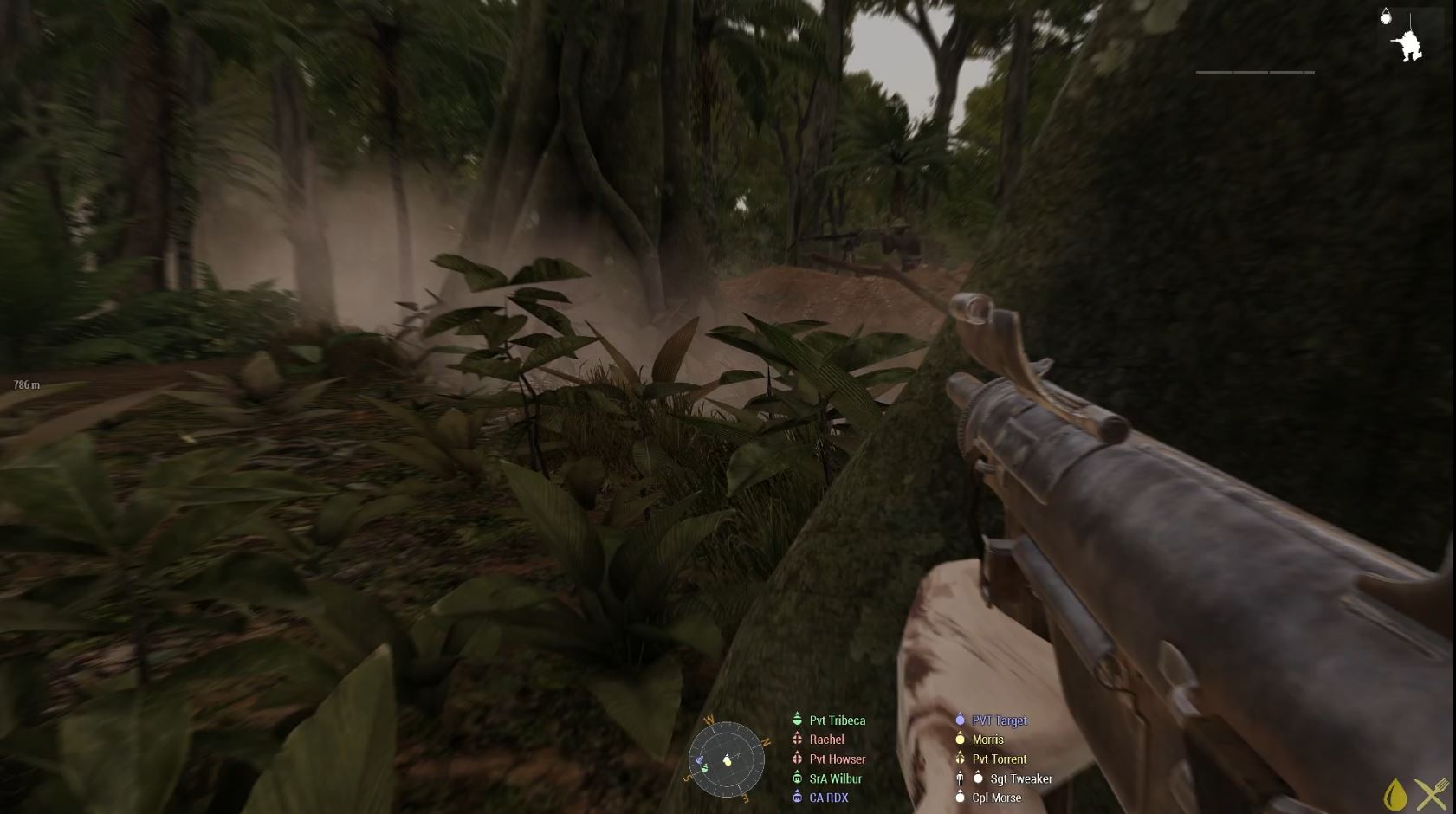 Or mostly north. Turns out there were a bunch of tripwires attached to smoke grenades scattered all over the slope, so we had to keep zig-zagging away as soon as someone set one off, so we weren’t hit by the ordinance that rapidly followed. And, also, while I think on it, that Airforce puke I told you about? He kept bumping into me and showing me aside on the way up. If they did that in the air they’d be in a whole heap of trouble, yet somehow he thinks it’s okay down in the mud? Typical. (No, I’m not just grumpy and having to climb a bunch of hills, why do you ask?)