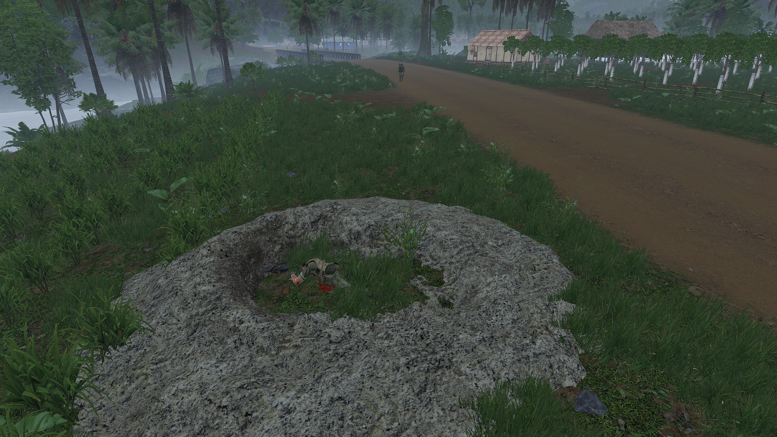 We then drove for a bit, firing across at the opposite bank of the river as Chelt fired back at us, but the only thing that slowed us down was the speed required for the supply truck, and the sodding hills. Still at least we weren’t climbing them on foot. It was also still raining, but once you’re soaked though you can’t really get much wetter, so I didn’t really notice after a while. Thankfully, what the driver did notice, was a satchel charge on the side of the road, so we stopped again. It was just before a bend, so RDX went to deal with them while the rest of us presumed there was something round the bend and went to pre-emptively deal with it. Turns out it was two Chelt machine gun vehicles hiding behind a rock, and some others in spider holes, but Yellow Squad happened to them and we went back to clear out the few who had snuck around to hit the trucks.