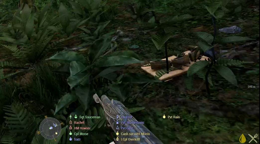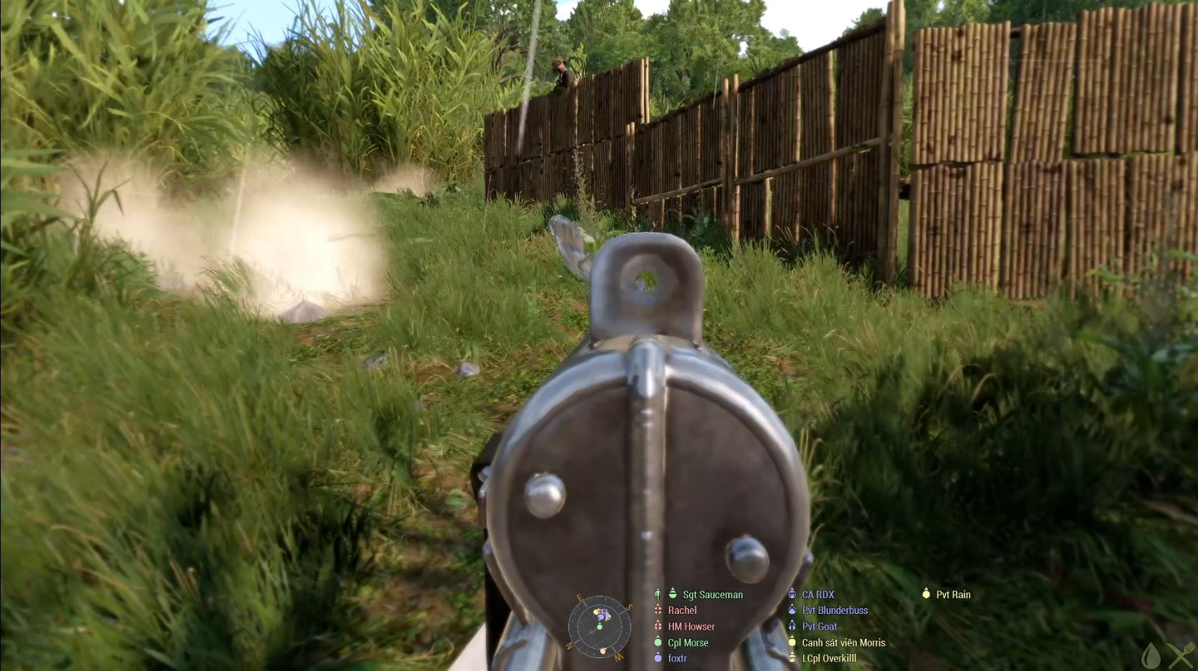 As they knew where we were we set off, uphill, at speed. There was a load of open space which would have been lovely to go through, but we hugged the cover as best we could instead, with reeds giving way to trees as we got higher. As the trees closed in we hit our first contact, which I spent most of dragging casualties to Howser (one of our medics) as I couldn’t see a thing in the undergrowth. When we made it to the top there was another open area full of long grass. I don’t know if I’ve mentioned this before, but they always hide in the long grass, so while it looks like great cover, it’s just not, because they got there first. This time they got there early enough to build a proper encampment, complete with wooden walls and everything. I’m sure you’ll not be surprised to learn that even that was no match for the USMC though!