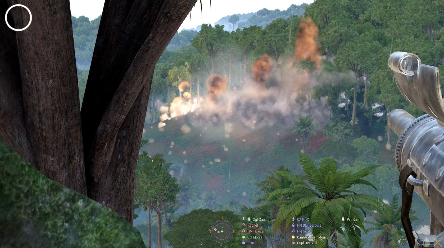 What we didn’t know at that time, but soon found out, was that the enemies had artillery too, and they put theirs much closer to us. Half the squad thought it was mine, which led to a few (understandably) testy exchanges over the radio, but I was vindicated in the end, and got some lovely hits in on the hostile positions on the other side of the valley. However, on moving up to confirm the area was clear it became rapidly apparent that the enemy still had artillery capabilities, and was watching us, so we had to go the long way round the head of the valley so we could stay in the cover of the jungle.