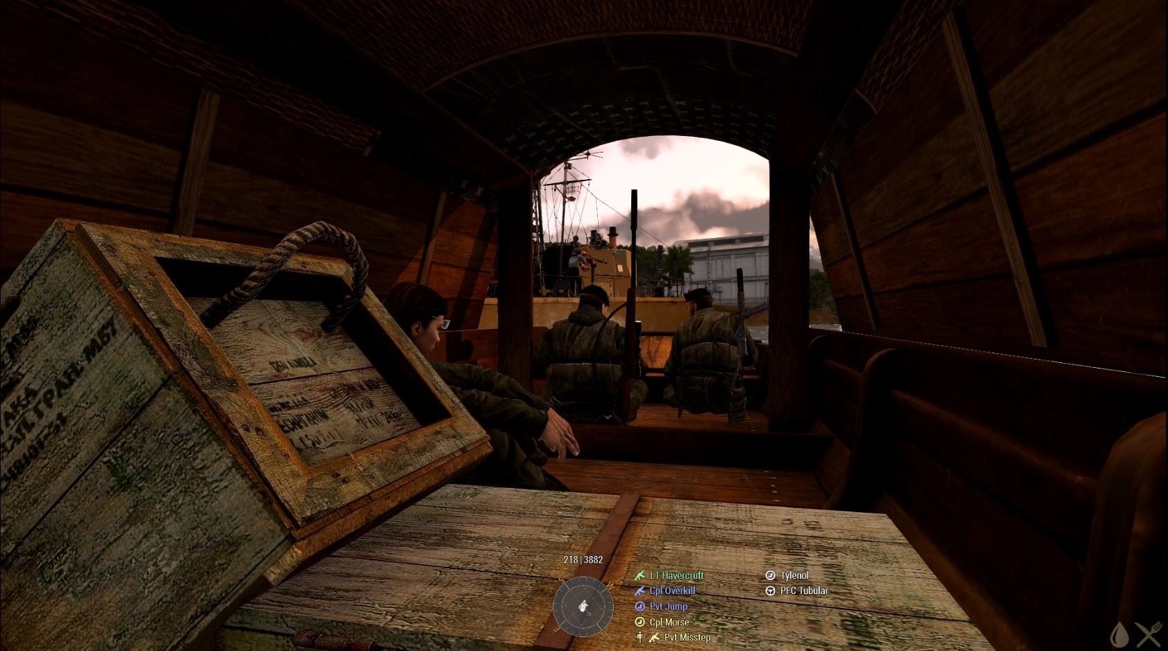 We then borrowed a sampan to get across the river to the third warehouse, where we once again met armed resistance. Fortunately there are marines in the squad who can effectively deal with that, and as the LT and I did a search inside we found the Milk Tray we’d been sent for. Getting back was a little hairy, as a patrol was coming up towards us, and then as we got back into the sampan a North Chelt patrol boat came up behind us. Thankfully we kept our cool and it sailed past us without incident. We got as close to our base as we could in that sampan, but eventually had to abandon it as the waters got too shallow for it to pass.