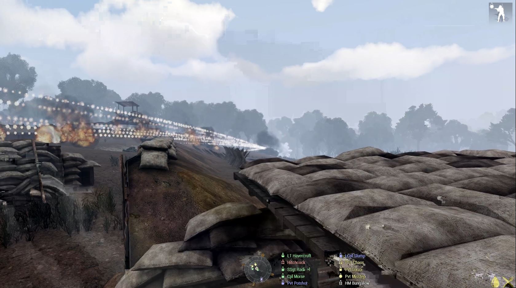 Day five dawned with another push from the enemy, but we cleared it quickly enough. They kept pounding us with mortars though, and comms with Yellow remained broken to the point of unreadable so we went back to waiting. I filled some of the morning doing laps of the camp perimeter, checking for infiltrators, and trying to memorise as much of it as possible so I’d know on another pass if they’d cut the wire anywhere or such. I even spent some time up in one of the machine gun towers, which is usually an immediate prelude to getting shot in the head, but this time it wasn’t bullets or mortars that came our way, but flame rockets. That’s a new one for me, but I can’t really recommend them. Someone was observing for them, but we never found out where from.