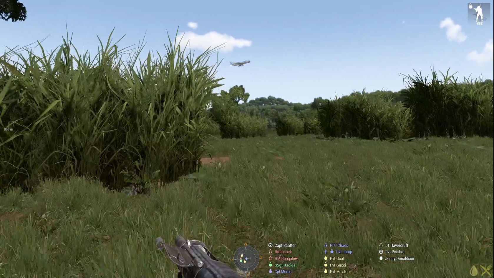 We weren’t sure on that at the time though, and there was a village nearby he could have been taken to, so we went and cleared that too. And the fort on a giant rock in the middle of the river that could only be reached by a narrow rickety rope bridge. I tell you Mom, it was like something out of a kid’s adventure book, only less treasure, and more people trying to kill us. There was no sign of the pilot and we were about to go hunting elsewhere when air told us the 5th and final parachute had been seen just across the river. Blue Team (Best Team!) swam across and met some resistance before Jump found the pilot and we turned back towards the rest of the squad. It was a fighting withdrawal and this guy didn’t want to swim which complicated matters, but eventually we reunited with Yellow Team and started to make our way to the evac helo which had landed nearby.