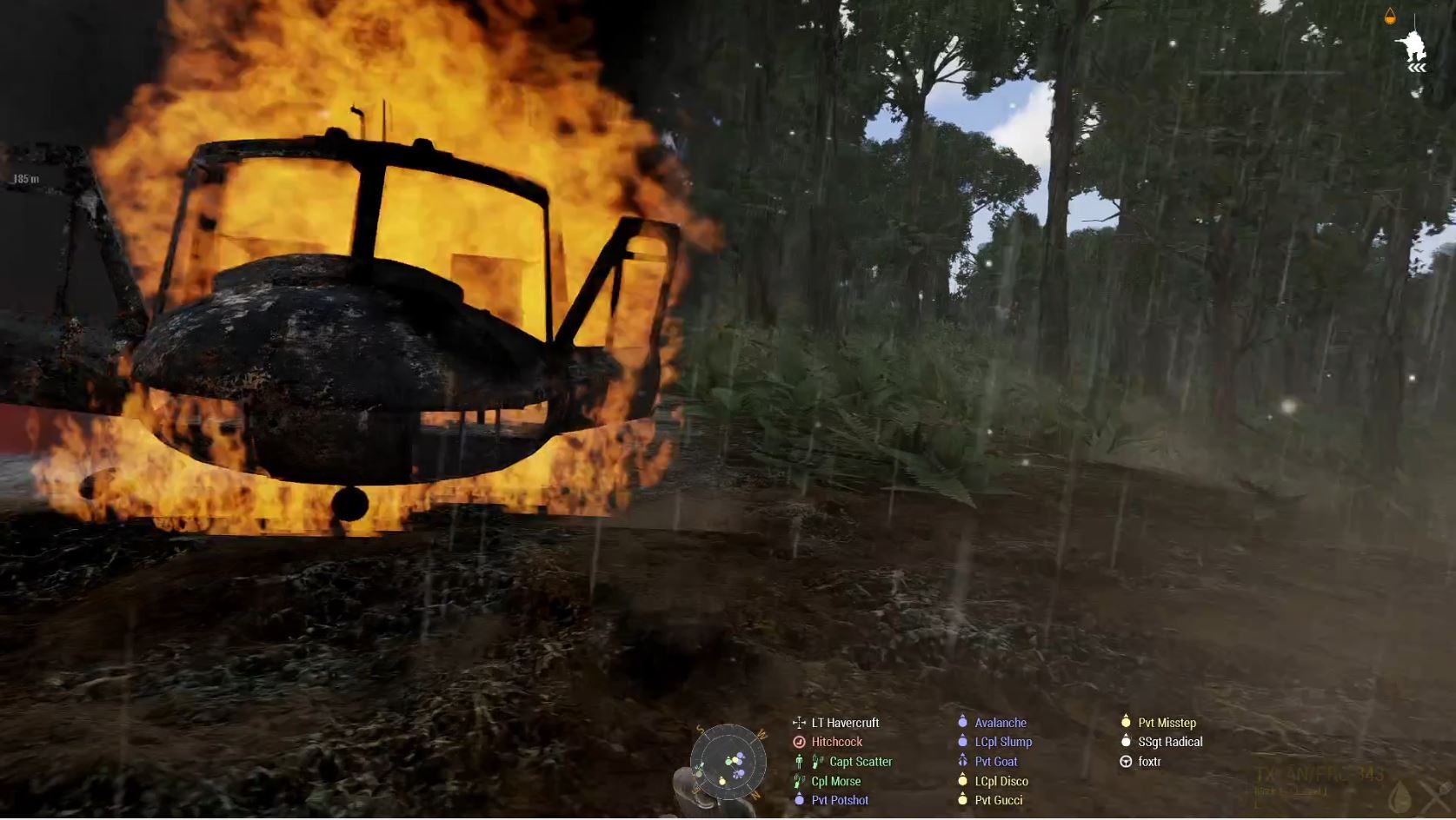 Once we’d made it to the river it was time for the first swim. This one was across a small tributary to where we could then swim the main river over to a large island, which had a village on it. The cache we were after was then on a much smaller island by the village. Unfortunately, the huey had long since reported the village as being enemy held and garrisoned. We think it was here that LCpl Slump picked up whatever it is he then shared about, and as we made the swim to the island the huey went in on some attack runs to soften up the village defenders for us. I think they dealt with the worst of it, but we still met with stiff resistance, including some rather unsporting use of molotovs. Our final push was then across to the smaller island to mop us the last of the resistance and destroy the supplies. That wasn’t the end of the swimming of course, there was no suitable LZ on the island, so we had to go back, but we were then on our way back to base where we could quarantine the afflicted.