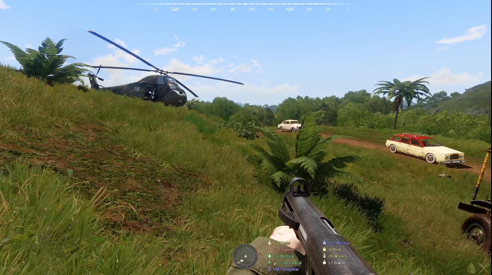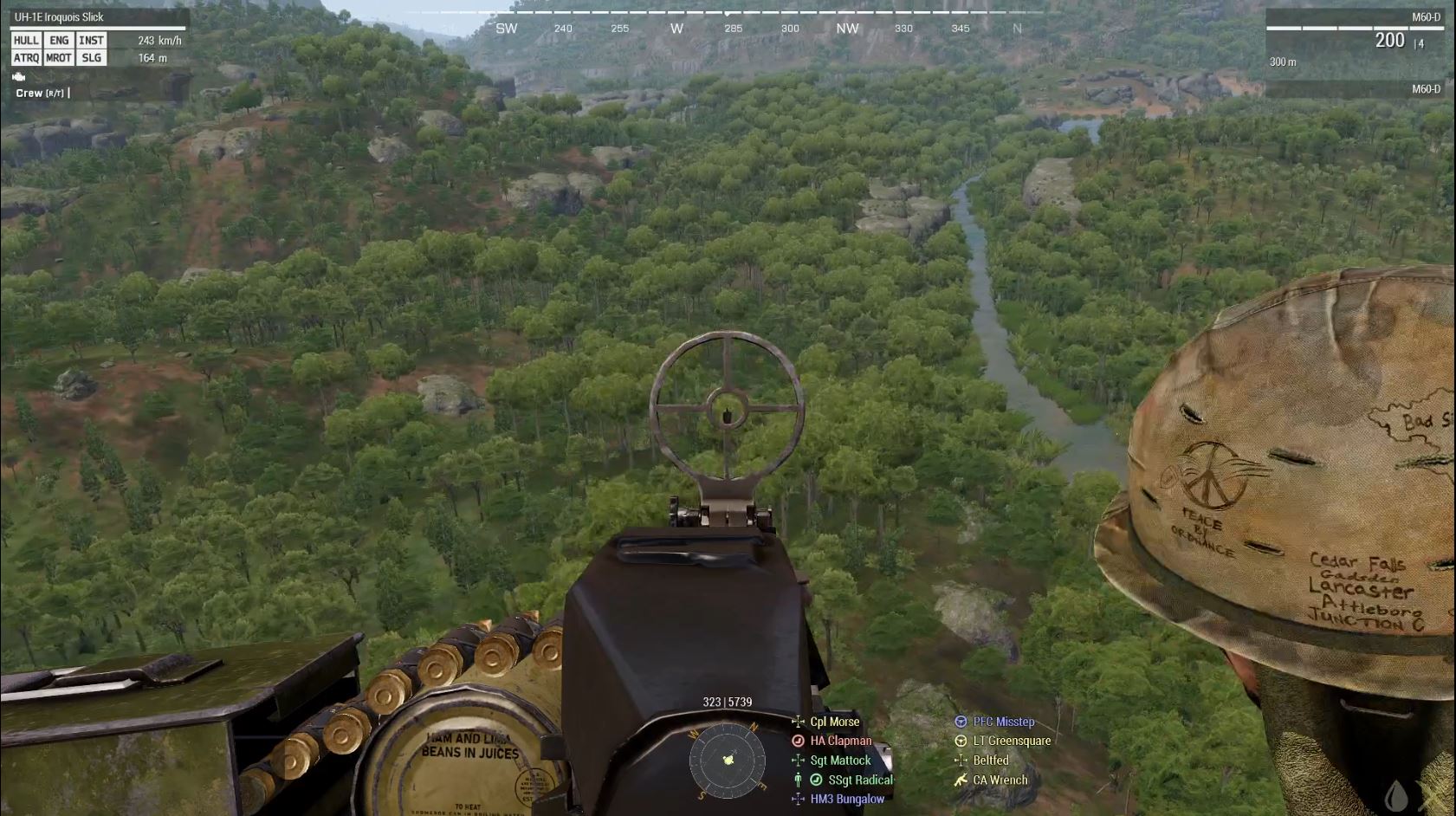 Well, some events, there’s some I can’t talk about, but that’s just the way of things I’m afraid. Like yesterday. I can’t say where we were, nor exactly what we were doing, but it seems like as good a place to start as any. The Colonel sent us out in a pair of helos to hunt for a number of convoys heading through the jungle to North Cheltnam. We needed to find them, stop them without destroying them, secure the cargo in the trucks, and get it back into US held territory safely. We started out with a Loach for scouting the jungle while the rest of us sat off the sides of a Huey to check the river crossings. The Loach did really well and spotted a convoy almost immediately, and fortunately we were close by the Huey so our response time was, if I do say so myself, impressive.
