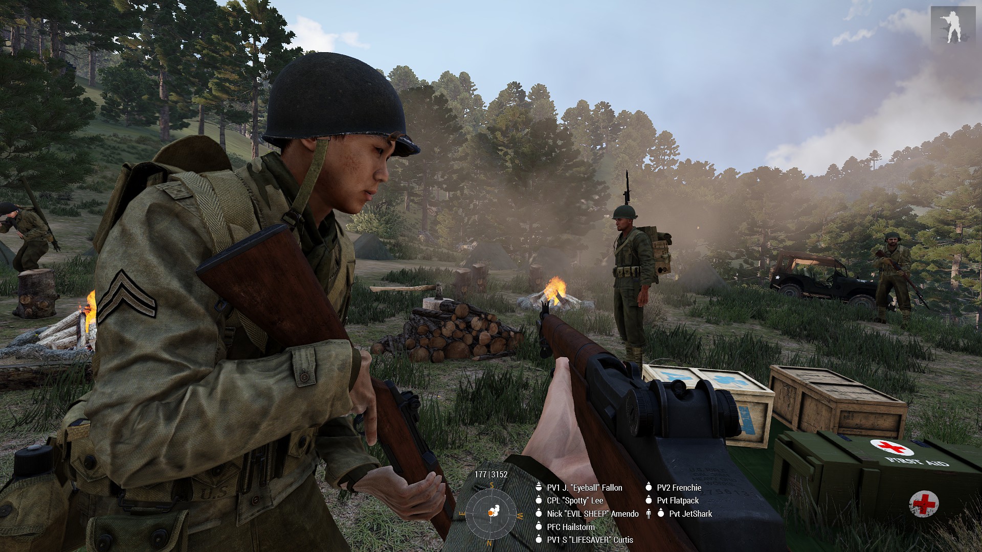 Took part in and initiated textbook ambush of motorised formation that allowed perimeter of airfield to be maintained. Rendered immediate medic aid to team-mates whilst under fire allowing for defensive position to be held without burdening stretched medical staff and for injured team mates to rejoin the defense in a timely manner allowing enfilading fire on an assault hitting another part of the defensive line, driving that assault off.