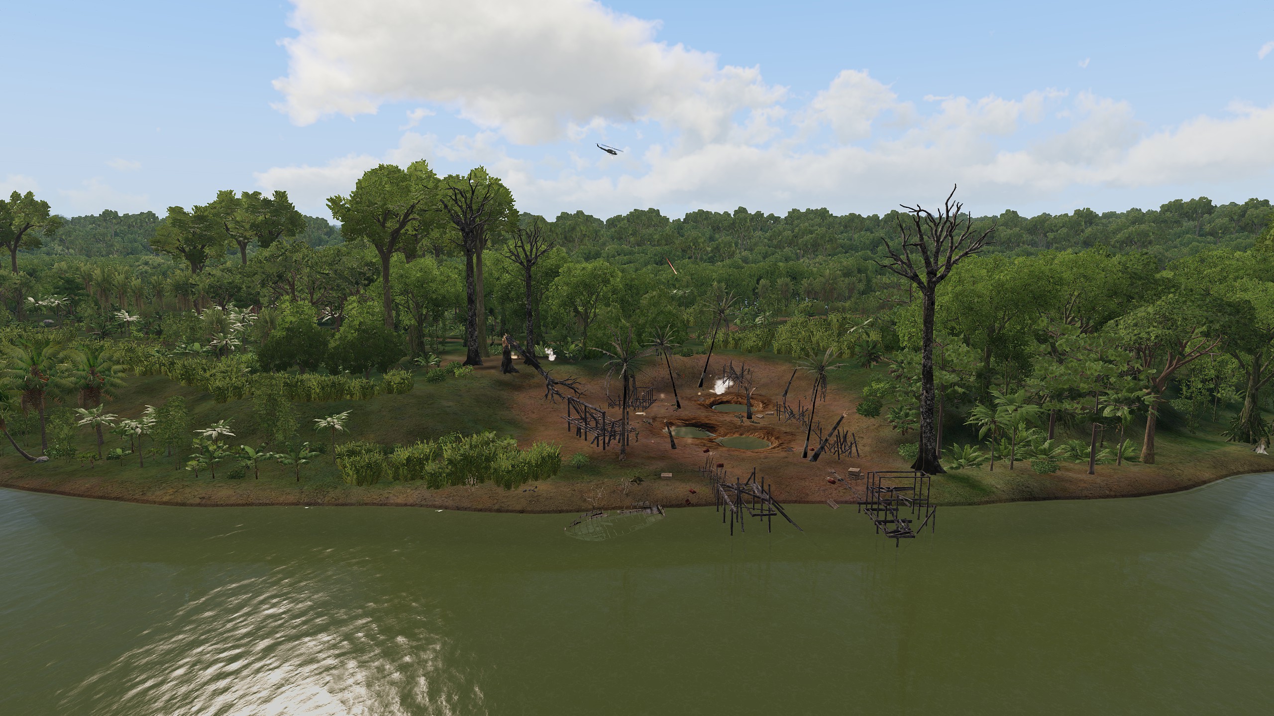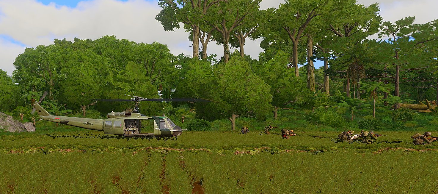 c) Finally the squad were tasked to an exploded river patrol boat. With heavy ground fire the lead helo had to circle several time sto find an LZ, leaving the squad with a hike along the river bank to reach the casualties. Eyes in the sky alerted those on the ground to the presence of guntrucks and fire was heavy across the river. Finding all eight crew took time, and the medical team worked wonders to keep the squad upright and fighting until all either were accounted for. The helos reported a possible LZ around 200m SE of the destroyed boat, and casualties were relayed there as quickly as possible, although not without the squad taking more fire from the opposing bank. With the first helo partially loaded and under heavy fire it took off before it was damaged too badly, and the second helo came in to colelct the rest. Under heavy fire the remaining casualties were loaded, and the squad jumped aboard just as Chelt foces crossed the river and attacked the LZ directly. Unfortunately two squad members were unable to fit in the helo, but by that point the first helo was on it's way back and everyone was successfully extracted.