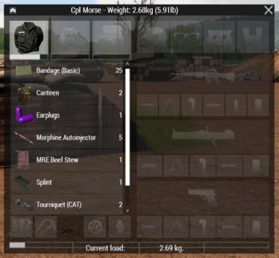 Combat loadout varies depending on your character and your role. It will normally contain at least a primary weapon, often a secondary (pistol or melee), and sometimes a shoulder mounted weapon. It will also contain a helmet or hat, webbing, backpack, radio, earplugs, medical supplies and grenades, as well as a canteen, a meal, and spare magazines for your weapon(s).