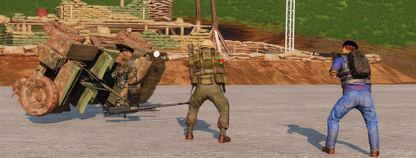 Moving west the squad broke line of sight with the fortified position and moved through the jungle towards an overwatch location, from where they hoped to be able to survey the surrounding high ground. Upon close approach to the hilltop it became apparent that it was occupied by a hostile garrison with vehicular support. A barrage of small arms fire was put down to pin the enemy in their positions while mortar fire was adjusted onto the hilltop. This artillary barrage proved exceptionally deadly, and all hostiles were eliminated without further risk to the marines.