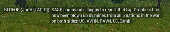 With the temporary unavailability of Capt Scatter it fell to Sgt Dropbear to liasise with Bravo Bravo Six One to co-ordinate the naval support due to him admitting to being equiped with both map /and/ long range radio. Despite claiming to be woefully unprepared for the responsibility, Sgt Dropbear showed a level of courage and commitment that would not go amiss amongst the finest of the USMC, enabling multiple successful strikes on hostile vehicle columns and preventing Chelt forces from retaking the bridge and combining their forces to push south. A credit to his service.