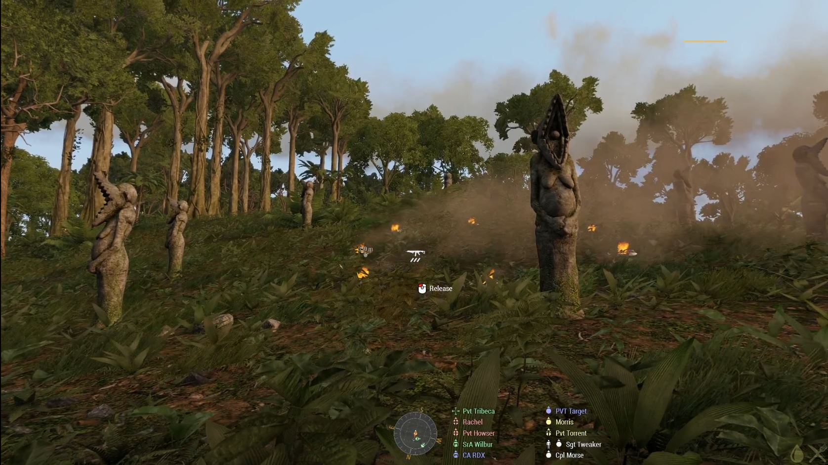 We had to deal with a small scattering of local resistance as we approached the top, but they were quickly overpowered and we had a moment to consider which option for down we would take. We’d been told that the hostile encampments on the western hills were not in our AO, but there were a few small dips and depressions on the western flanks of our ridgeline that we needed to check out. Turns out they were all clear, but we didn’t find that out until the recoilless rifle on the other side had spotted us. I’d’ve loved to have taken it out with artillery, and the Sarge wanted to as well, but it would have left the squad vulnerable for a prolonged period, so we just called in its coordinates and Foxtrot Oscared.