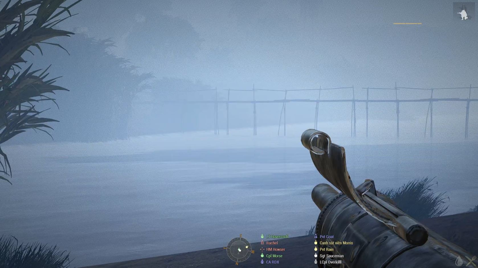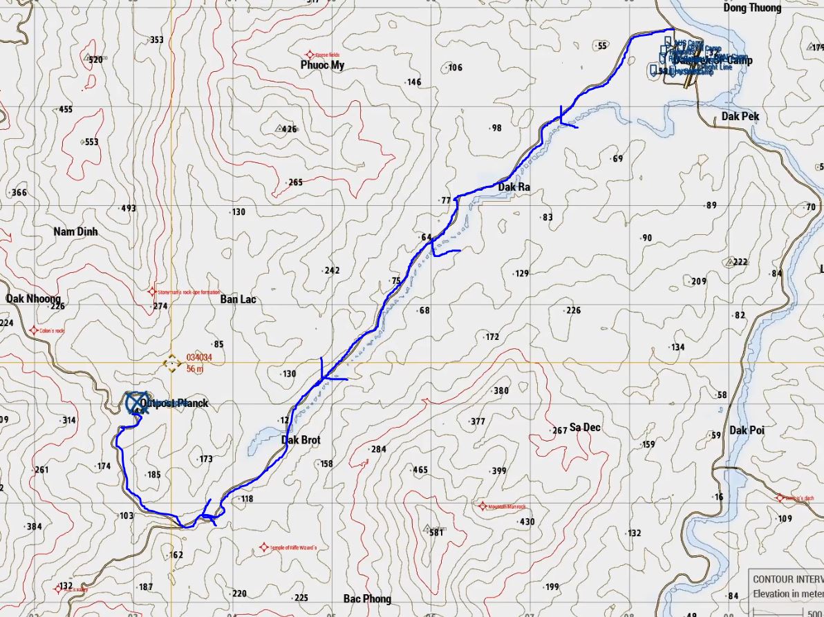 Oh! I almost forgot. We were also attacked as we entered a village called Dak Brot, before the bridge I mentioned, but it also had a bridge. We thought we’d cleared the contact, but then realised that our machine gunner, Goat, wasn’t with us, so we ran back to find him. Overkill found him first, and as I got to within feet of him he got shot too, so I hit the dirt pronto! I threw a smoke grenade for cover first, then a frag once I knew where the shooting was coming from. With the LT backing me up I cleared the bastards out, then had to go back to help him as he’d been bleeding for ages and not bandaged himself. Or he’d just got shot then and there, one of the two. Either way, we got him, Goat, and Overkill back and then set off for the other bridge I mentioned above.