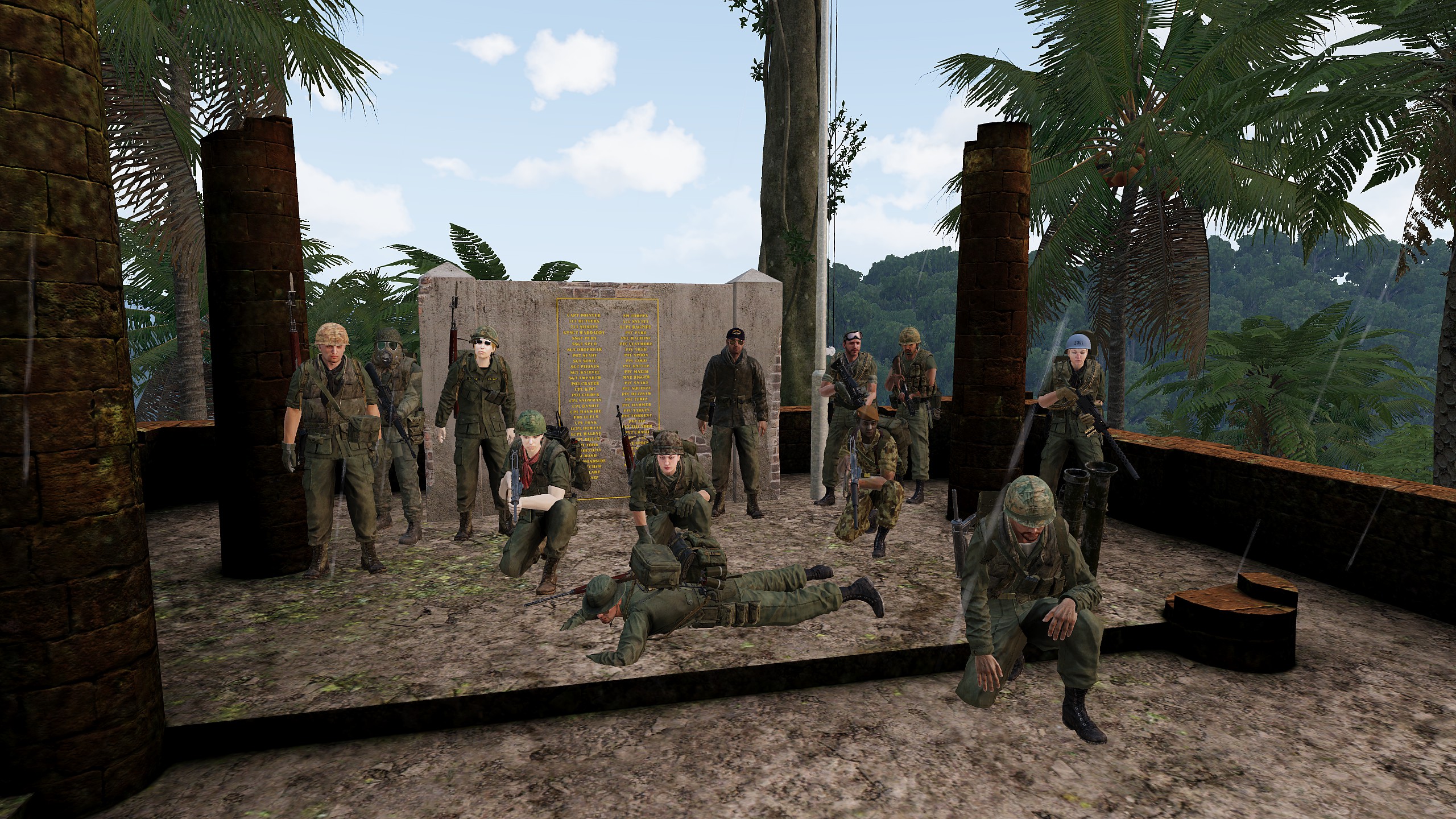 After a few days around base we were sent off into the jungle again this morning as a bunch of Chelt artillery sites were threatening to make things hard work for a while. Sarge was in charge (see what I did there?) as we loaded up into a truck, but it couldn’t take us far, as we needed to cross the river, and there aren’t any vehicle crossings near here. Still, any time we’re able to be off our feet and sat down while outside the wire is nice. The foot bridge we were dropped at was nothing more than some logs held above the water by lashed bamboo, and we could only cross single file, but it didn’t collapse and no one fell in. While we were crossing, I got a load of distortion on my radio though, so I told the Sarge I thought there’d been a spy in the village by the bridge who had just sent a message to inform the bases we were hunting for that we were coming. We didn’t get shot until after I told her that though, so it could have been worse.