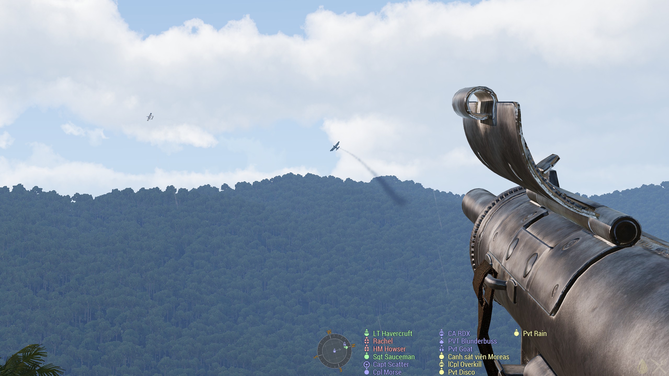 As we recovered them RDX’s eagle eyes spotted some hostile trucks heading towards us, so I vectored Mr Scatter Sir and his friends onto them. Bless the Air Force, they did their best, but it was Blunderbuss for the USMC who finished the attack off with one of his rockets. To make up for it the flyboys then napalmed a tree line that had been giving us problems and we pushed on up to clear up any stragglers and get in close to the actual crash site. While waiting for a resupply crate to be dropped, we were treated to the free spectacle of an air-to-air dog fight! The Chelt sent a biplane after Mr Scatter, but he showed them some good old American pluck and now has his first air-to-air kill, which seems to be a thing that those guys take seriously!