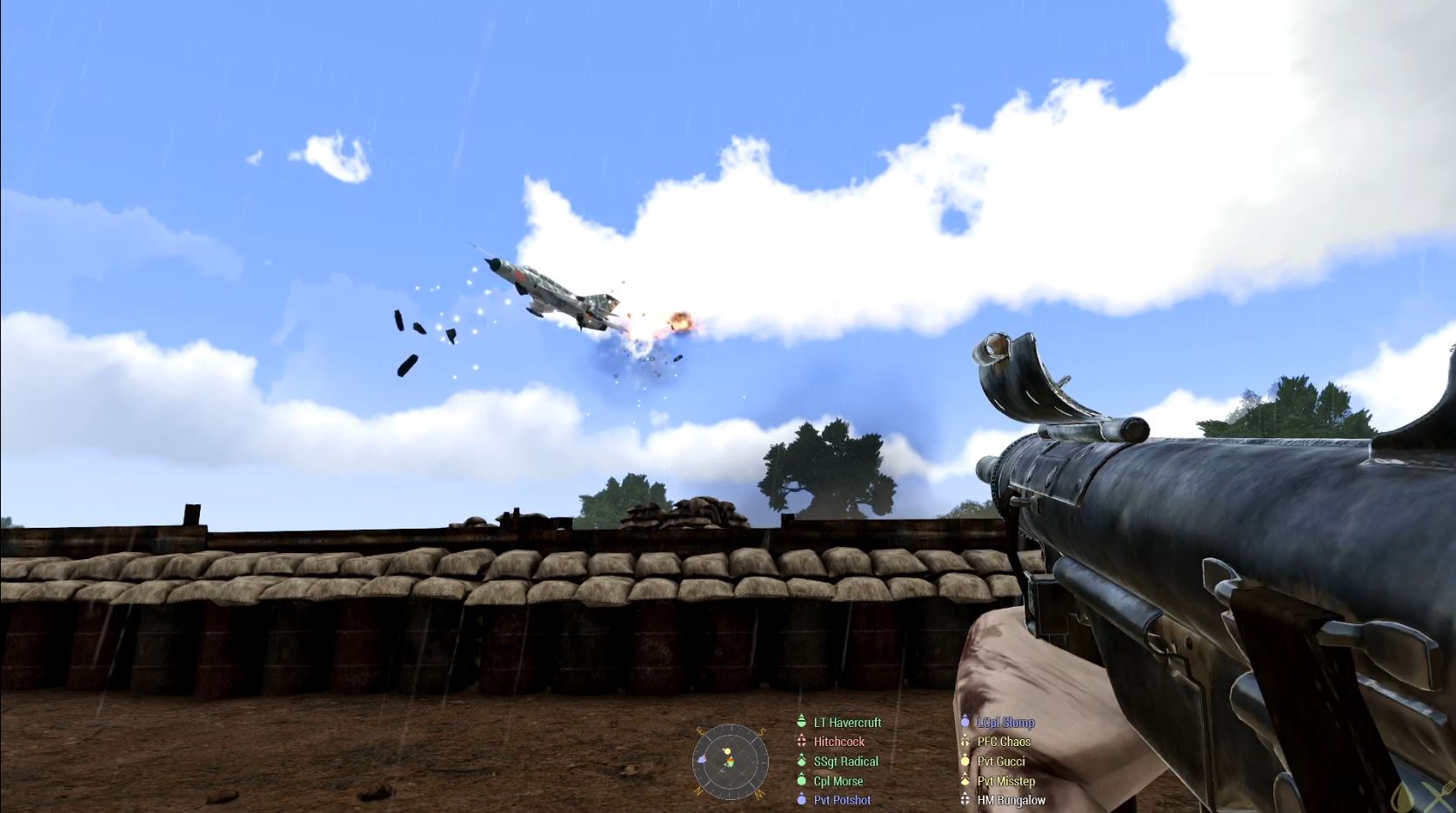 Despite the AA threat, the Colonel had clearly managed to pull some strings for us as a skyhawk flew overhead and dropped something on the enemy, then shortly after I got a checking from some flyboys from a flight called Chinese Whisper who had us mark our position with smoke and they committed some violence in the vicinity as well, but it was too dense foliage to tell precisely what. We were now heading south, skirting the edge of the swamp, and by my reckoning a little more than halfway to the LZ.