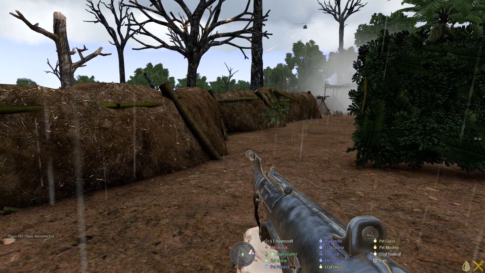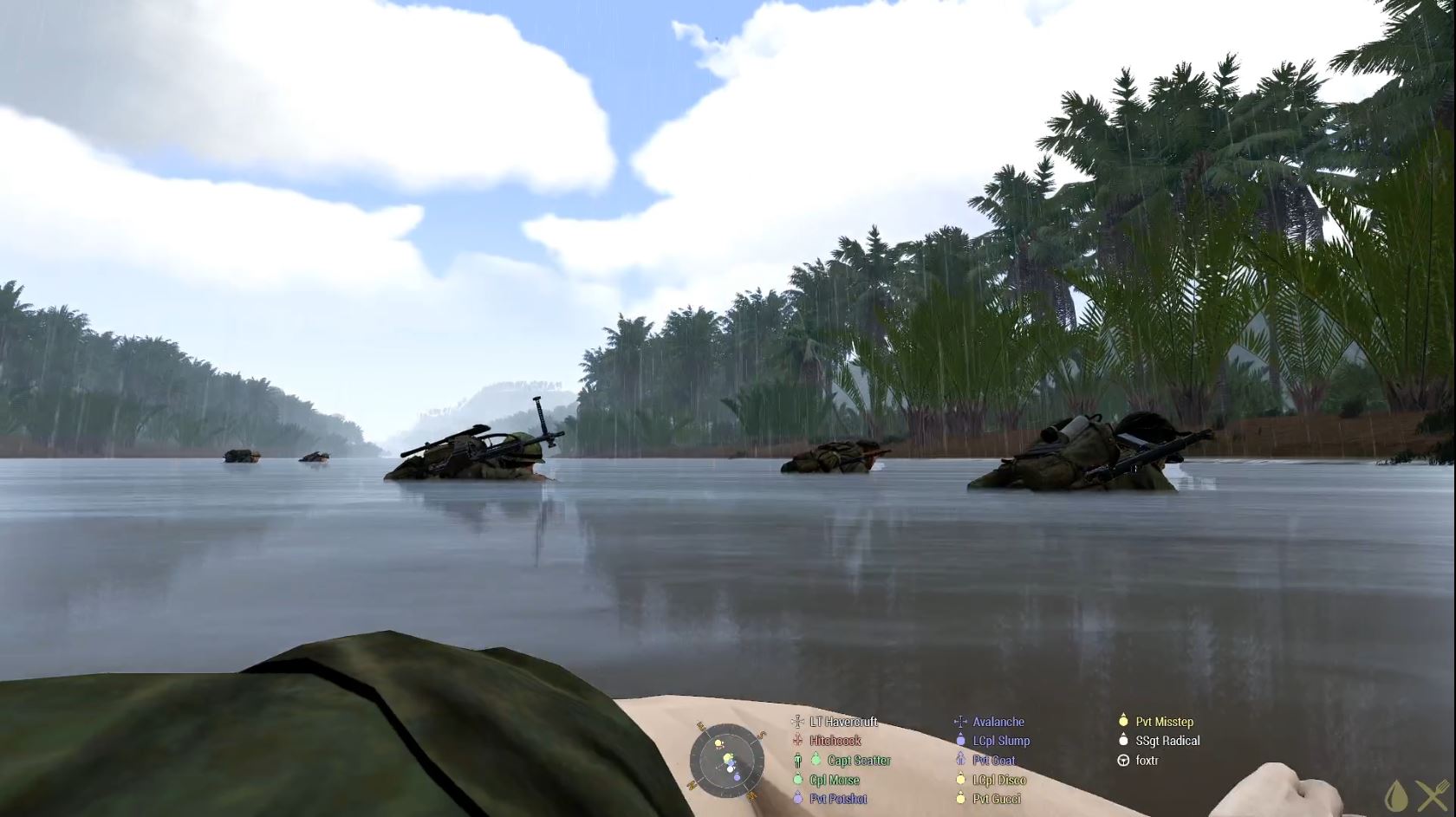 Once we’d made it to the river it was time for the first swim. This one was across a small tributary to where we could then swim the main river over to a large island, which had a village on it. The cache we were after was then on a much smaller island by the village. Unfortunately, the huey had long since reported the village as being enemy held and garrisoned. We think it was here that LCpl Slump picked up whatever it is he then shared about, and as we made the swim to the island the huey went in on some attack runs to soften up the village defenders for us. I think they dealt with the worst of it, but we still met with stiff resistance, including some rather unsporting use of molotovs. Our final push was then across to the smaller island to mop us the last of the resistance and destroy the supplies. That wasn’t the end of the swimming of course, there was no suitable LZ on the island, so we had to go back, but we were then on our way back to base where we could quarantine the afflicted.
