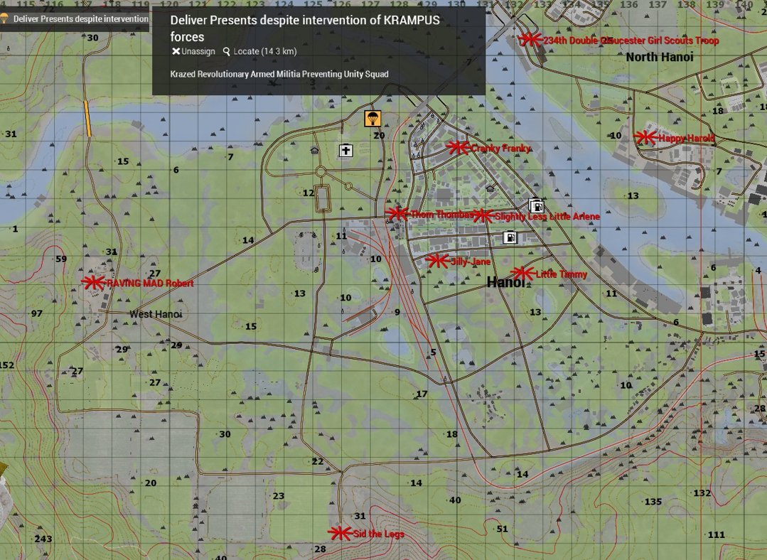 MajGen S.Claus sent us on a special mission deep into the heart of North ChelteNam to deliver joy (and presents) to the good little gils and boys. Reindeer squadron had taken out enemy fast air to allow us to insert, but the enemy forces known as KRAMPUS tried to stop us reaching the following children with their christmas lists as follows: