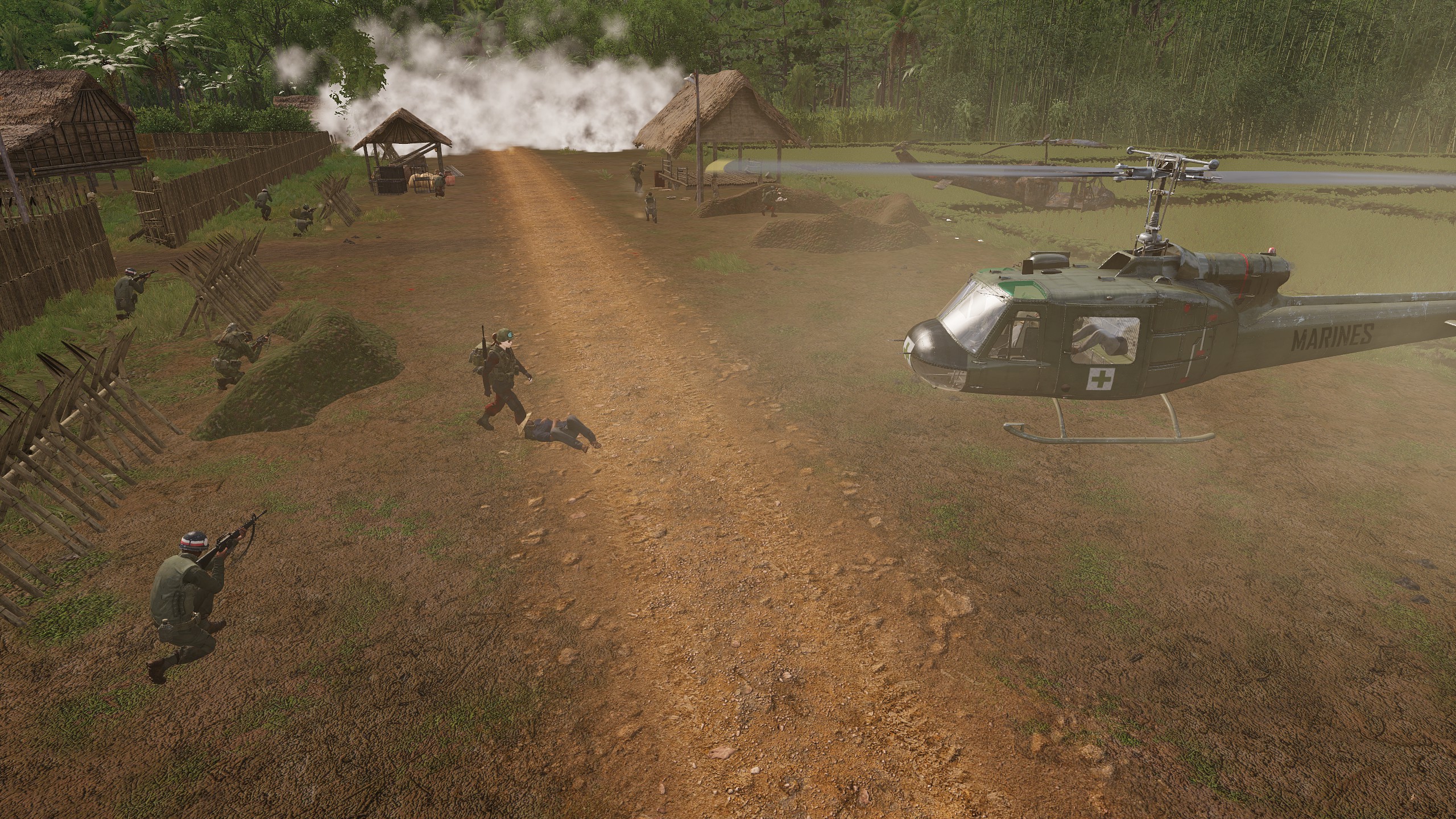 a) Transfering by road to the local medica station the Squad were ambushed but managed to drive through it, taking out some of their attackers as they sped by. Upon arriving though they were quickly dispatched in to medical helos to evaucate five casualties from a PoW camp that was under attack. The firist helo, carrying most of the squad, crashed during a hot landing, but no casualties were taken, and the ground troops moved to aid the defenders and locate the casualties as the second helo came in. With the casualties quickly located and send back the squad waited for the helos return, repulsed another attack wave, then exfilled when the surviving helo returned.